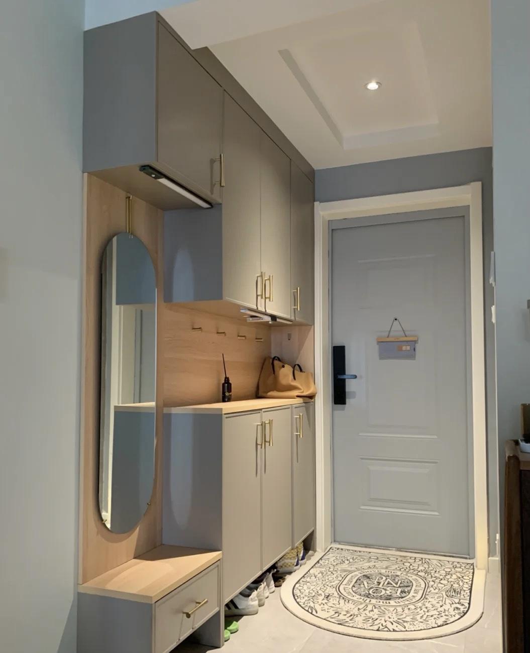 同时在左侧镂空处放置了一面全身镜,方便外出整理衣物,下方的柜子作为换鞋凳,换鞋更加方便。