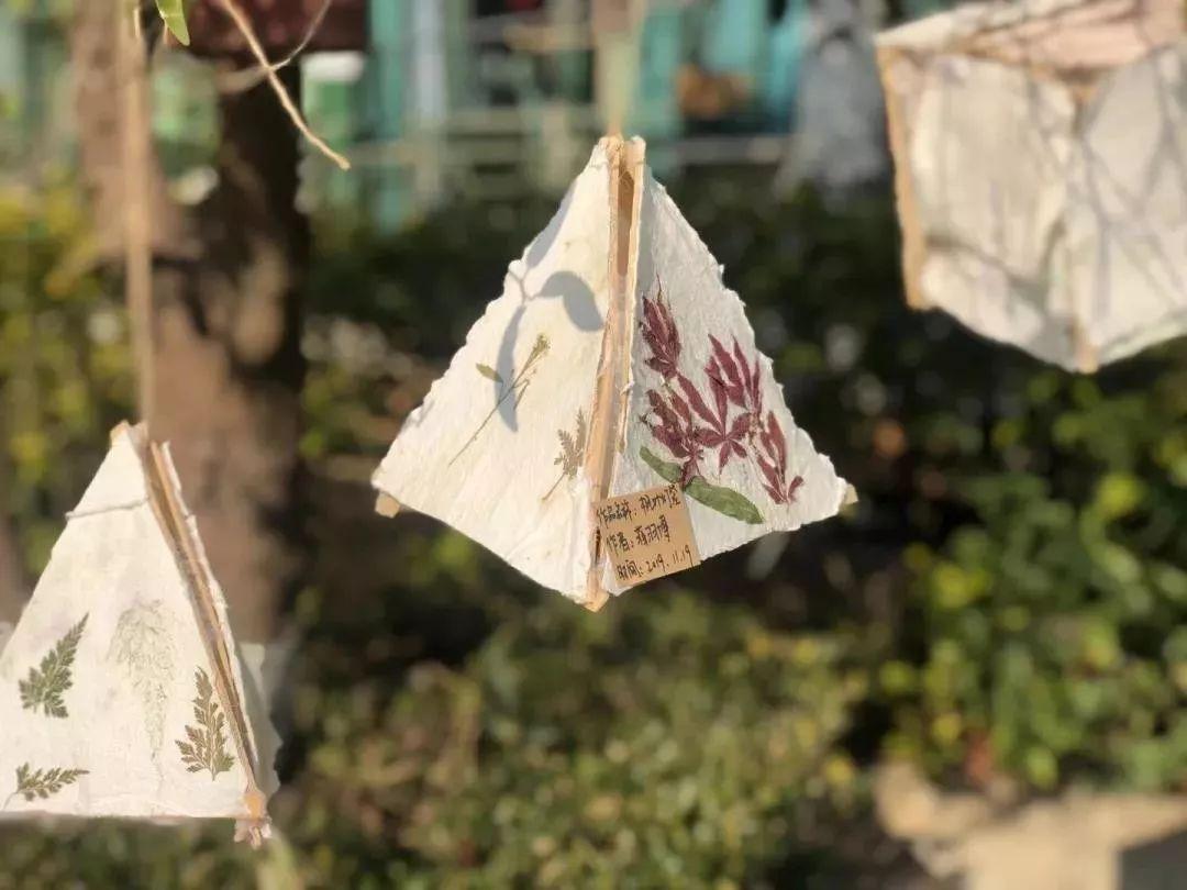 一边造纸,一边大家在树林里捡拾银杏叶、梧桐树叶、一些小草,还有香香的桂花,大家忍不住把这些就放在了纸浆里,可是这些能用来造纸吗?老师说:“那你们试试看,看看树叶花草会造出什么样的纸?”