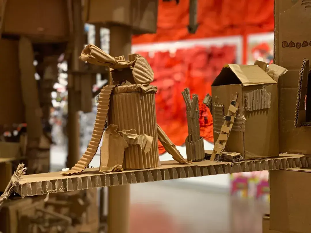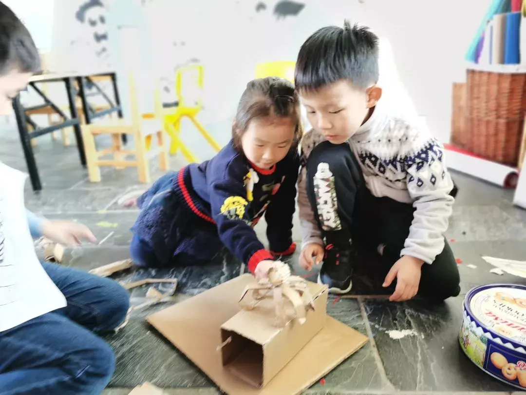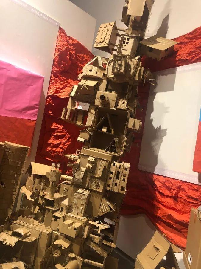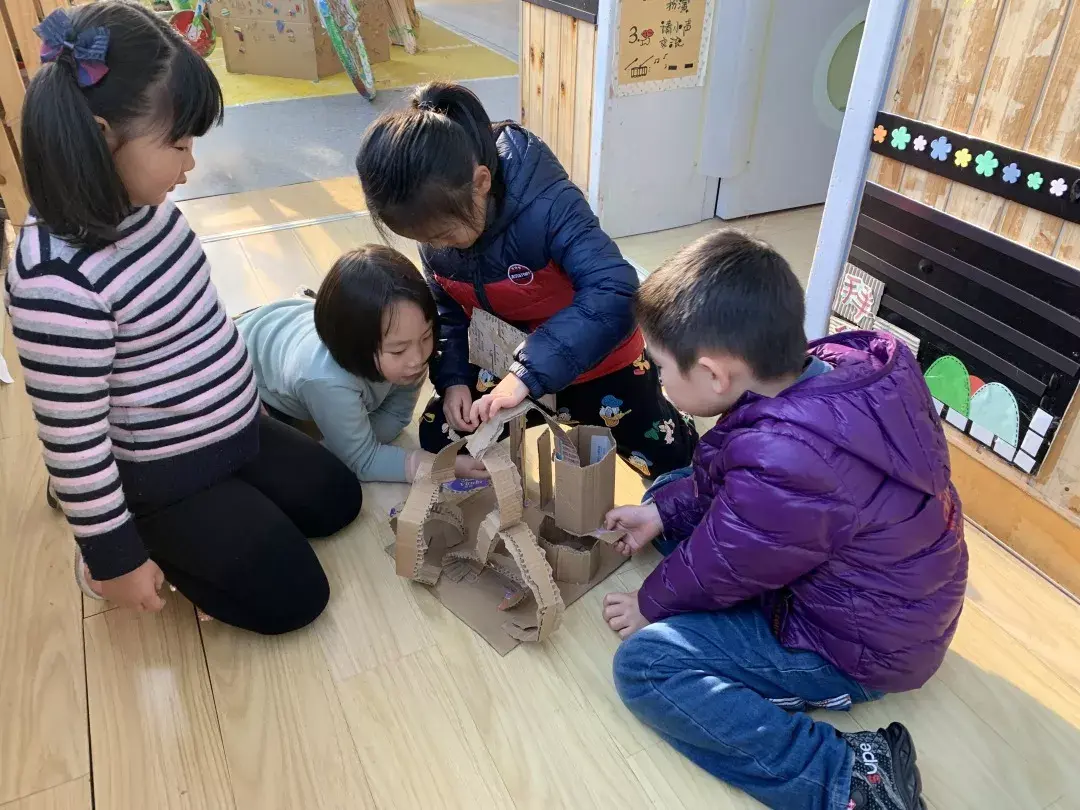 撕一撕、剪一剪、扣一扣,还有的卷、有的折、有的扭,镂空、连接、堆叠、垒高、重组、造形,纸箱纸板在孩子们手中变成了一座座有故事的小城。