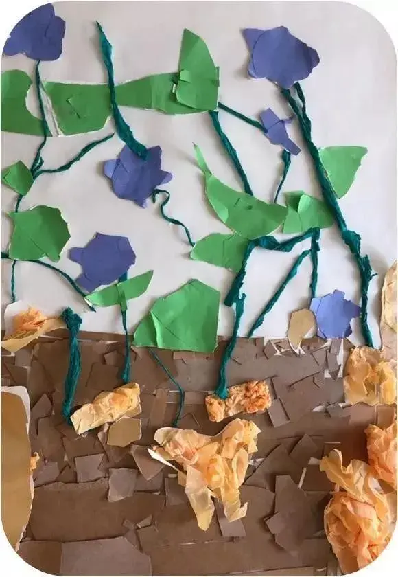 制作番薯花贴上番薯藤 变成番薯图 番薯成熟了,我们要去挖番薯了,那挖番薯我们要用到哪些工具呢?铲子、锄头、手套… …这些工具我们要怎么样制作呢?