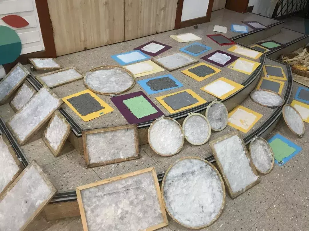 和小伙伴一起撕纸做纸浆、搅拌纸浆、平铺压制沥水、晾晒定型,终于造出了“纸”。