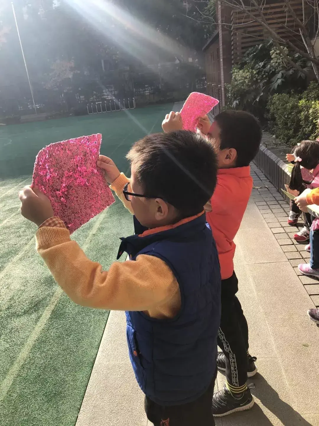 孩子们还惊奇地发现阳光底下的玻璃纸,格外光彩夺目,阳光透过玻璃纸折射出一道道美丽的彩虹,甚是绚烂。