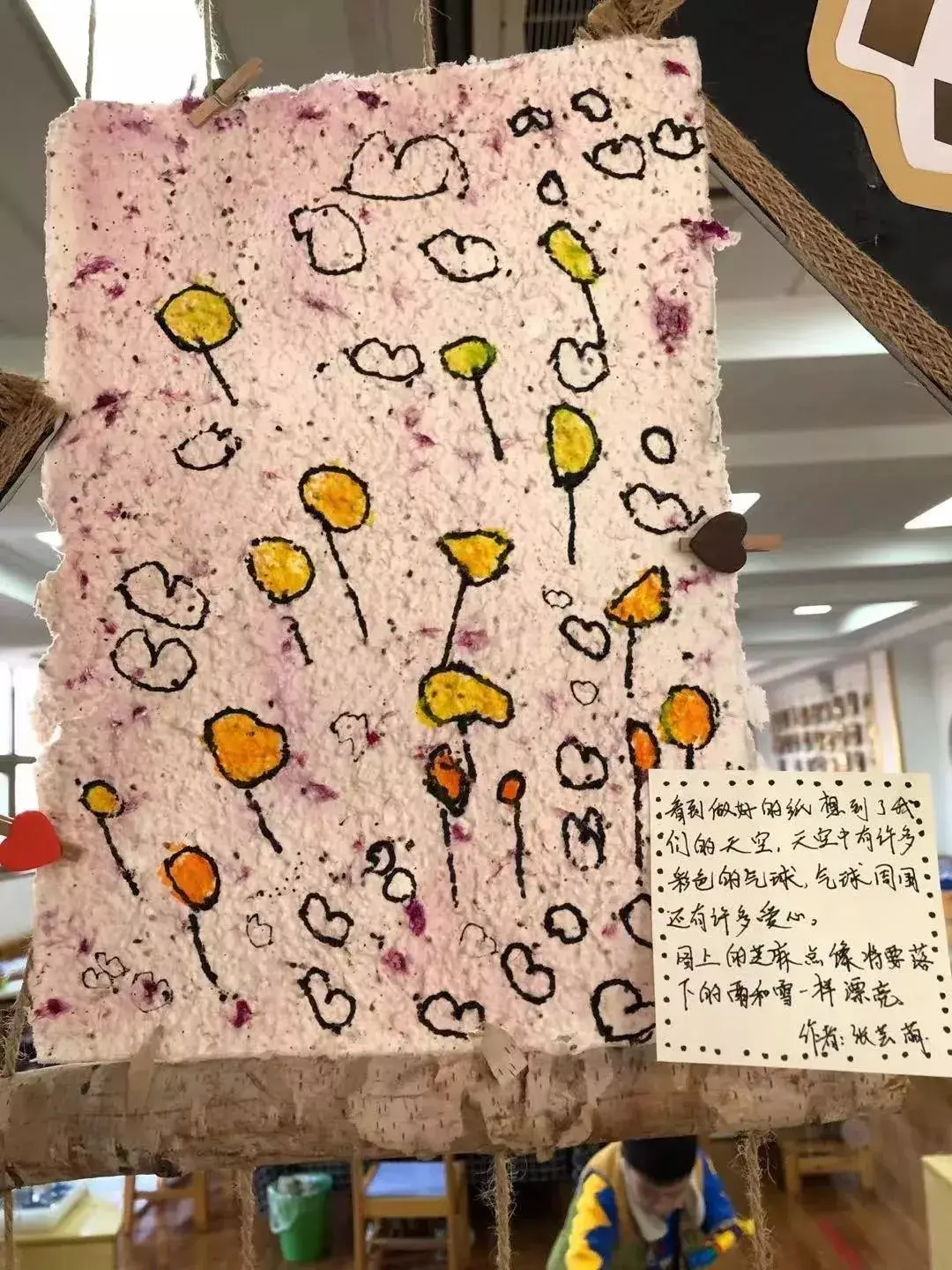 秋高气爽的日子里,每天孩子都会在小树林、小木屋、草地上去造纸。