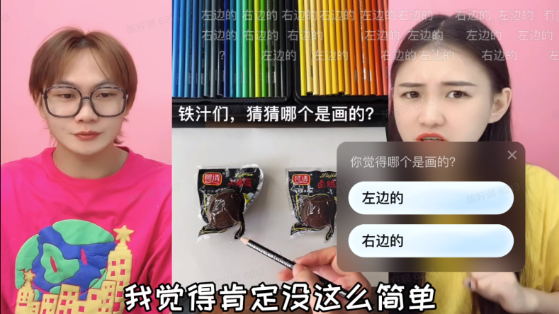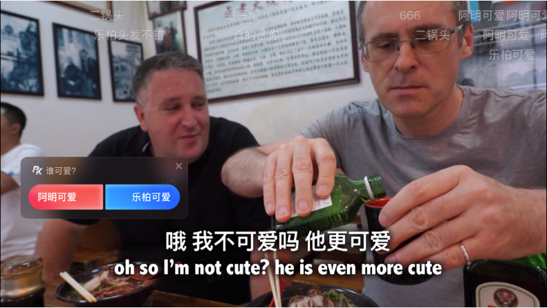 案例二:德国人第一次吃卤煮!二锅头和野格哪个更下饭?视频中的德国创作者乐柏带着自己的好朋友阿明去吃卤煮,吃到一半是视频中出现了一个声音说阿明真可爱,这是乐柏也像网友发起了一次PK投票询问自己与阿明谁更可爱呢?此时视频附上了一个PK贴纸让大家进行投票,不仅增加了视频的趣味性也让观众有了参与感!
