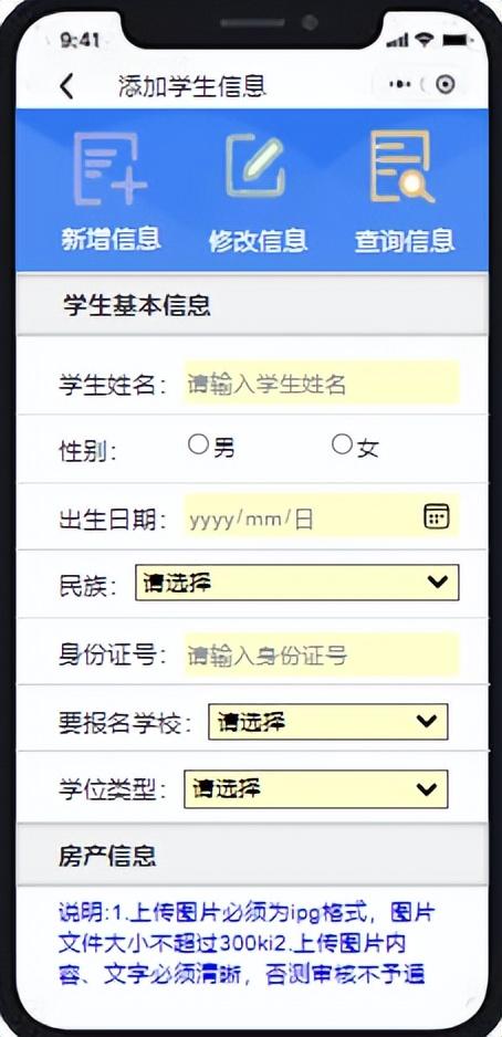 3.填写报名信息:进入学生信息填写界面,严格按照要求填写真实信息并上传相关图片,填写完毕点击“提交”按钮。