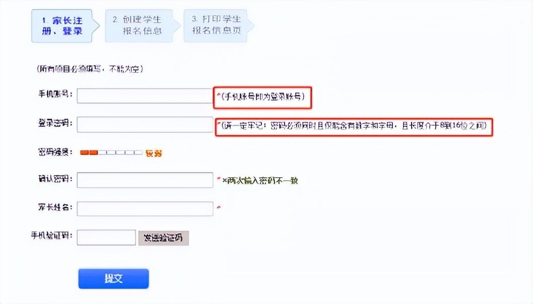 2.进入家长注册界面,按照要求填写家长信息,点击“提交”按钮。特别提醒:将用户名和密码保存好,登录时会用到。