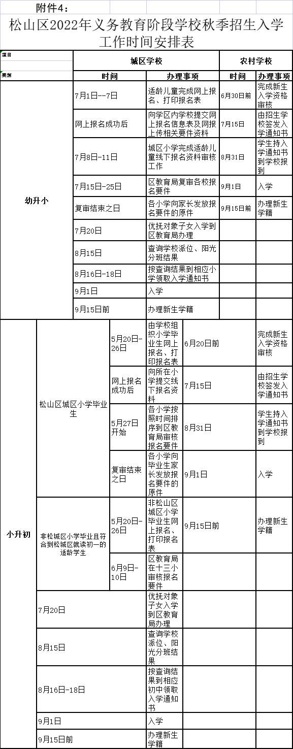 松山区2022年义务教育阶段学校秋季招生入学工作时间安排表