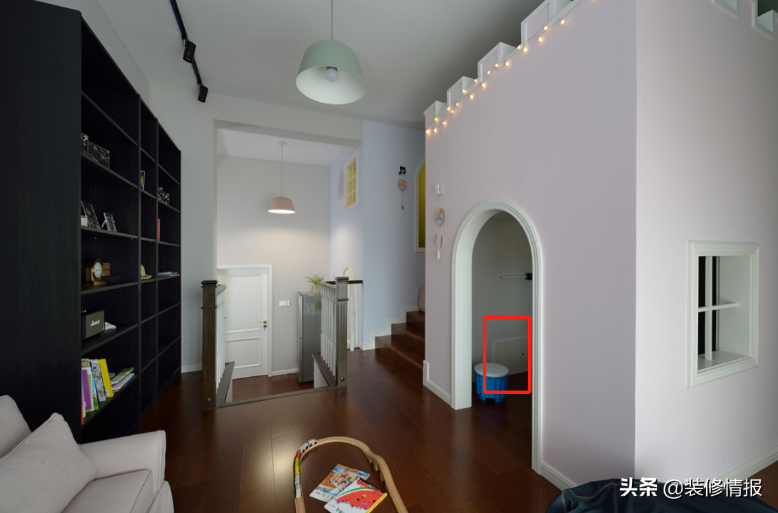 其实原先起居室的位置,业主也不知道怎么利用,如果做成起居室和楼下有点重复,可能是作为男性设计师的我对结构有着天生的热爱,在看看他们家可爱的双胞胎女儿,那么我们干脆在这个区域搭建两个城堡吧,涂上不同的颜色,门也设计成拱形,既有储物空间,又能满足孩子的活动空间。