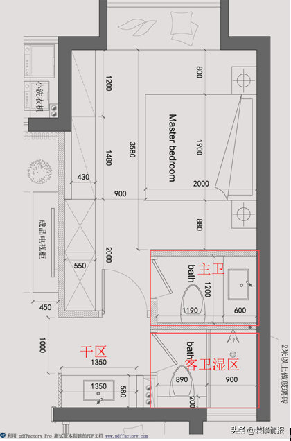 ▲左侧是小孩房隔出来的卫生间,注意马桶是用了后排马桶直接进主管道,这是最传统的改造方法,但是施工的时候要预先定好马桶,并且市面上后排马桶选择余地比较少了,还是建议上壁挂式水箱。右侧是公共卫生间的湿区,外面还有一个干区。