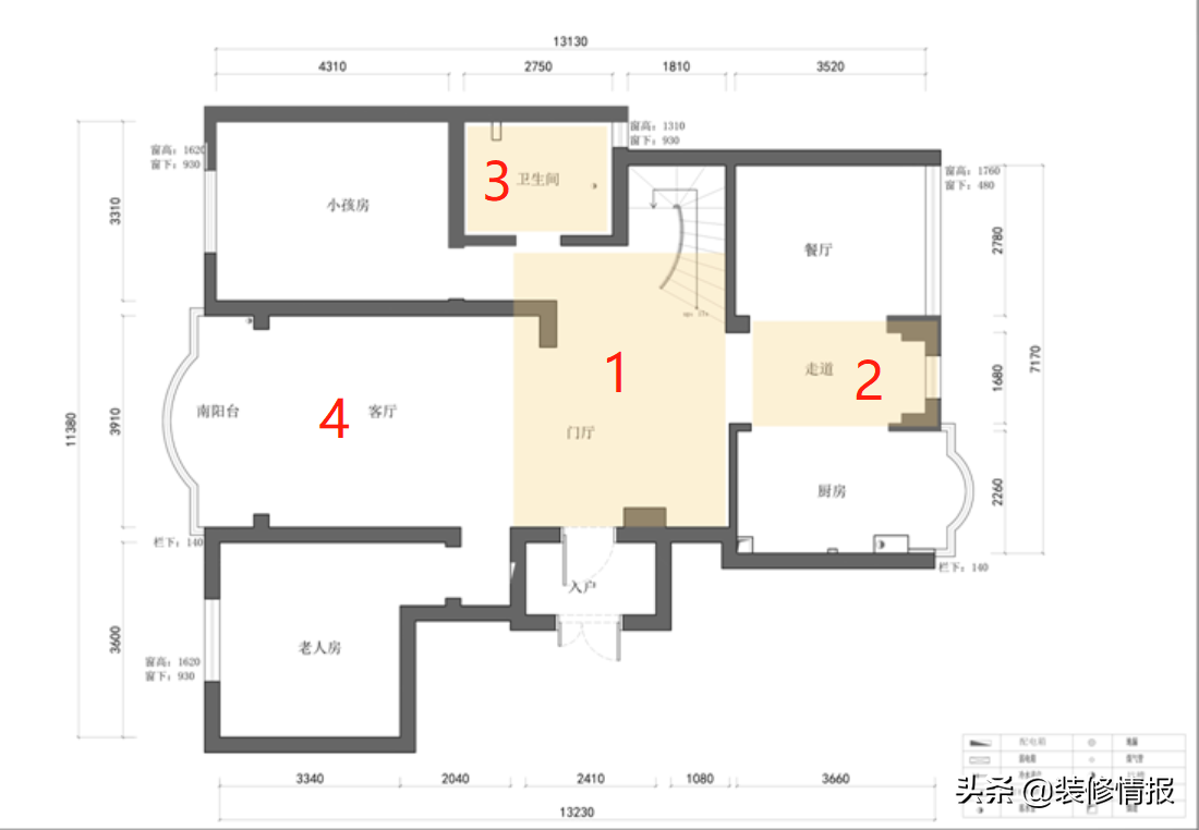 由于这是一套老房子翻新案子,当时去测量的时候第一个感觉房子的绝对面积还是可以的,一家四口,老人偶尔住住,房间是足够了。但是原来的房子,很多地方都没有利用起来,存在面积浪费的问题。例如下图中“1”进门右手边空旷的区域,和“2”厨房和餐厅之间的一块地方。