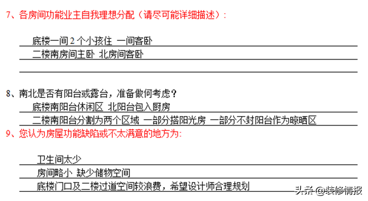 在讲具体设计方案时,先要讲讲业主的需求。其实,这是所有设计师做设计的基础前提,“一个不愿意聆听业主需求的设计师,绝对做不好设计”。设计师只有对业主家的情况越了解,越是能做出适合的方案。前期只需要提要求就可以了,具体怎么调整就交给设计师就可以了。