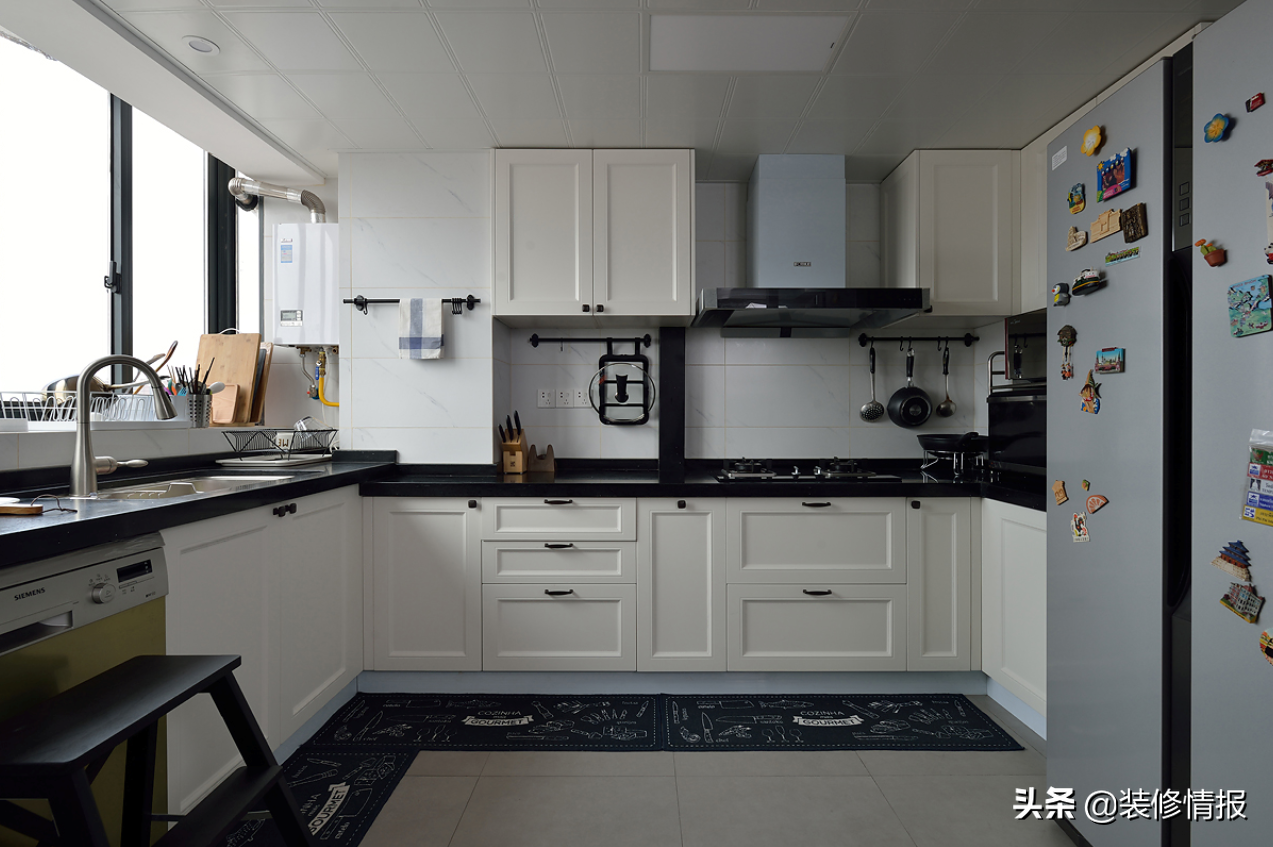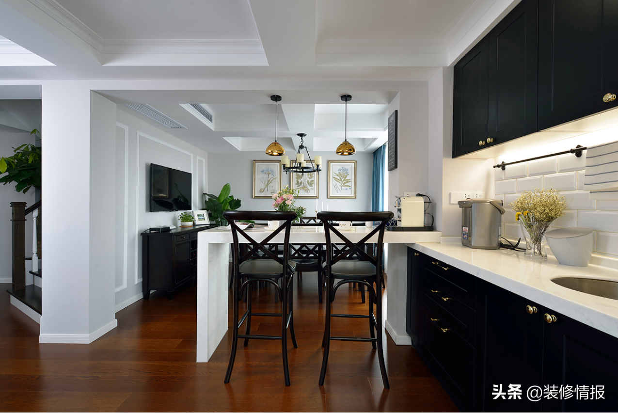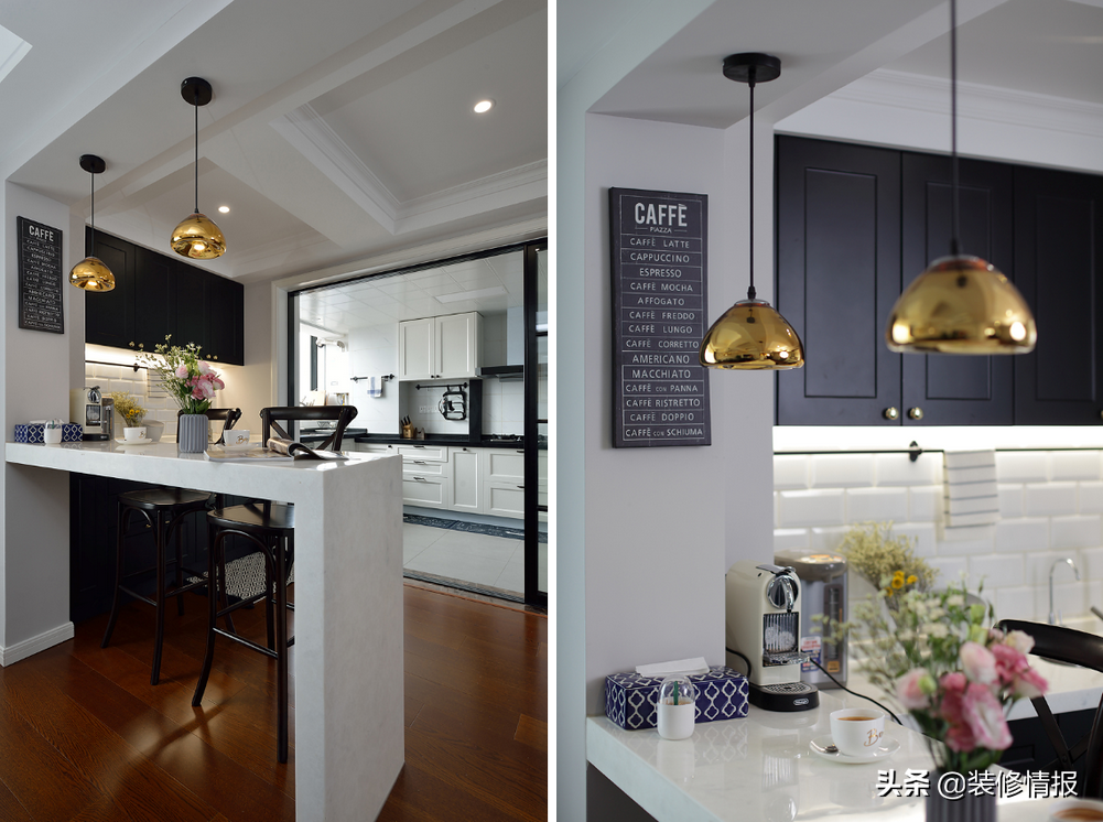 2、中西厨和餐厅的布局,原有厨房门口比较鸡肋的区域设计成西厨和L型吧台,增加互通性的同时也提高了厨房的储物空间和利用率,这样业主可以把不产生油烟的小家电放到外面来,使用非常方便。