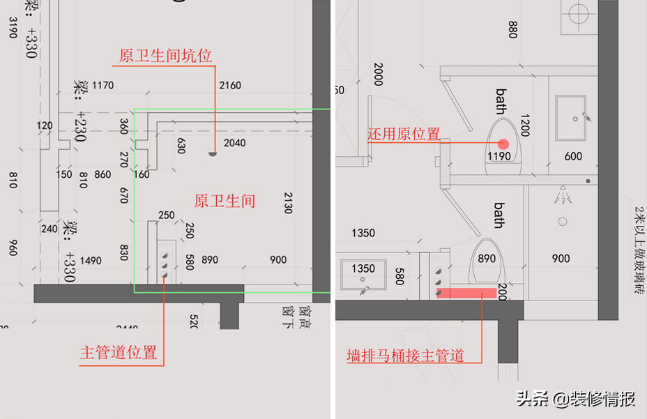 ▲上图是原始图和改造后的平面图,原有马桶位置不动,新增马桶做墙排水箱接到主管道。