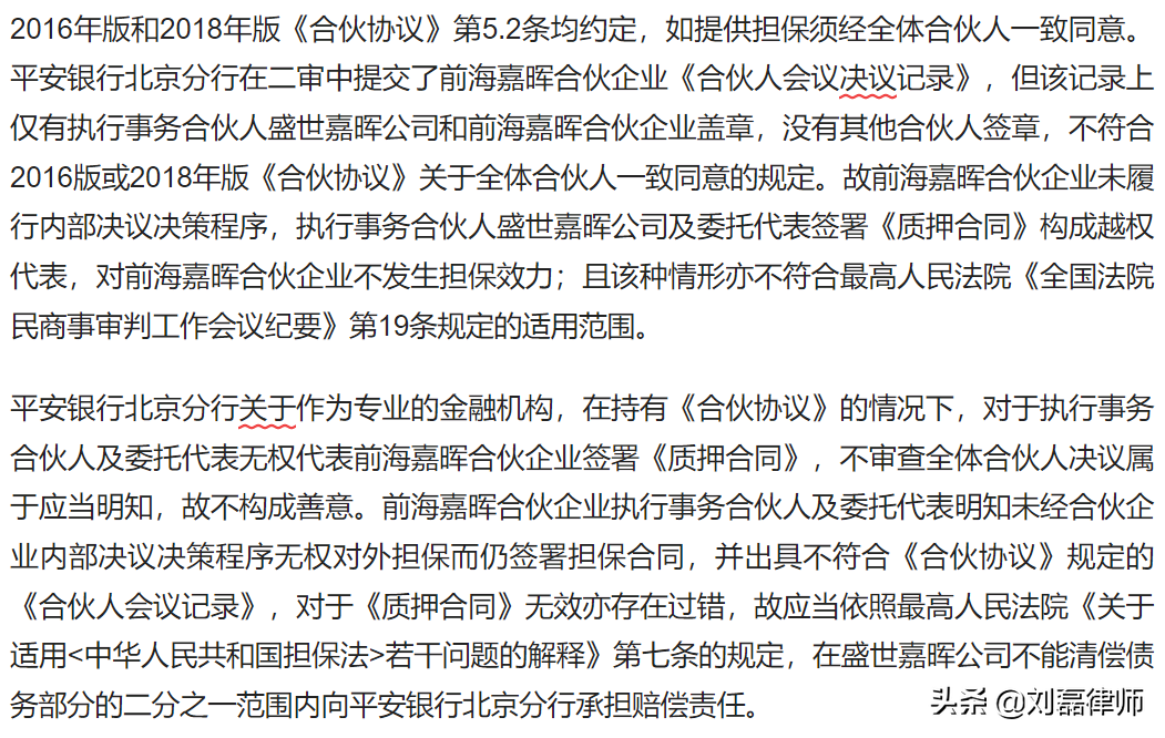 3. 另查明,前海嘉晖合伙企业2016年版及2018年版的《合伙协议》第5.2条均载明:非经全体合伙人一致同意,有限合伙不得以借入负债的方式进行投资,亦不得对他人之负债提供担保,如提供担保须经全体合伙人一致同意。而本案中前海嘉晖合伙企业所提供担保并未经全体合伙人一致同意。