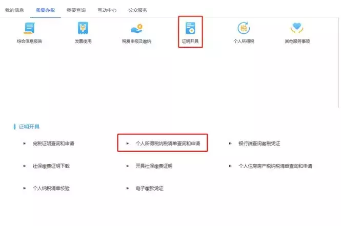 第三步:点击我要办税-证明开具-个人所得税纳税清单查询和申请,进入对应功能。