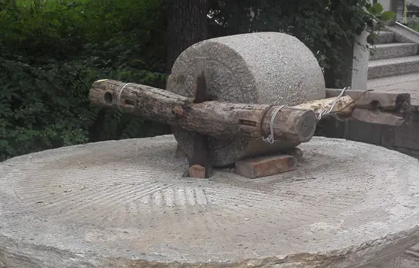 (农村常见的石碾磙子,是一种碾轧工具,装在轴架上可加工粮食)