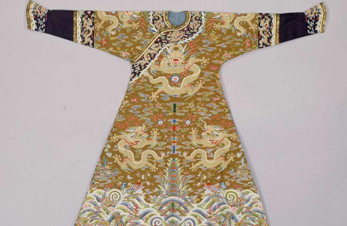 清乾隆年间香色缂丝金龙夹龙袍,龙袍纹饰精美,上面绣有金龙,象征着皇室威严