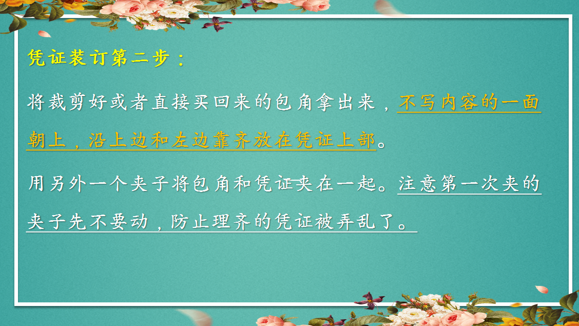 凭证装订第十步:折长边。折叠时要压紧粘牢,折叠处一定要有折痕处理。长边会将短边盖在内部使其不会被看到。