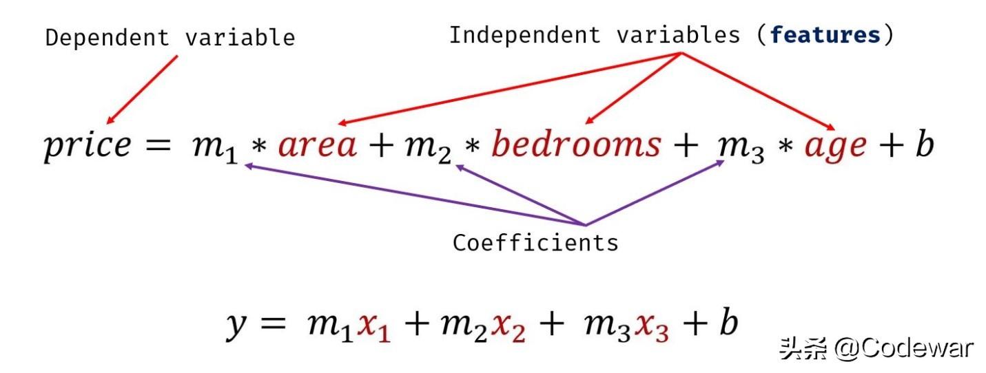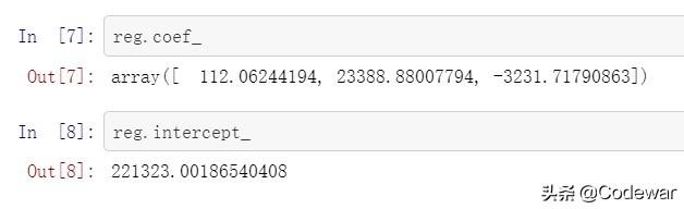 reg.fit(df.drop('price',axis='columns'),df.price)通过以上代码就拟合出了我们的多元线性回归模型,通过.coef_和.intercept_方法可以查看模型的回归系数和截距。