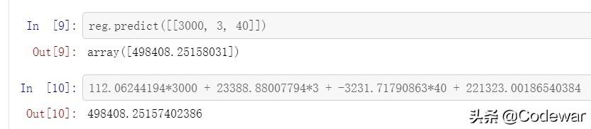 reg.predict([[3000, 3, 40]])可以看到,无论是通过.predict方法还是通过带入系数运算得到的预测结果都是一样的。