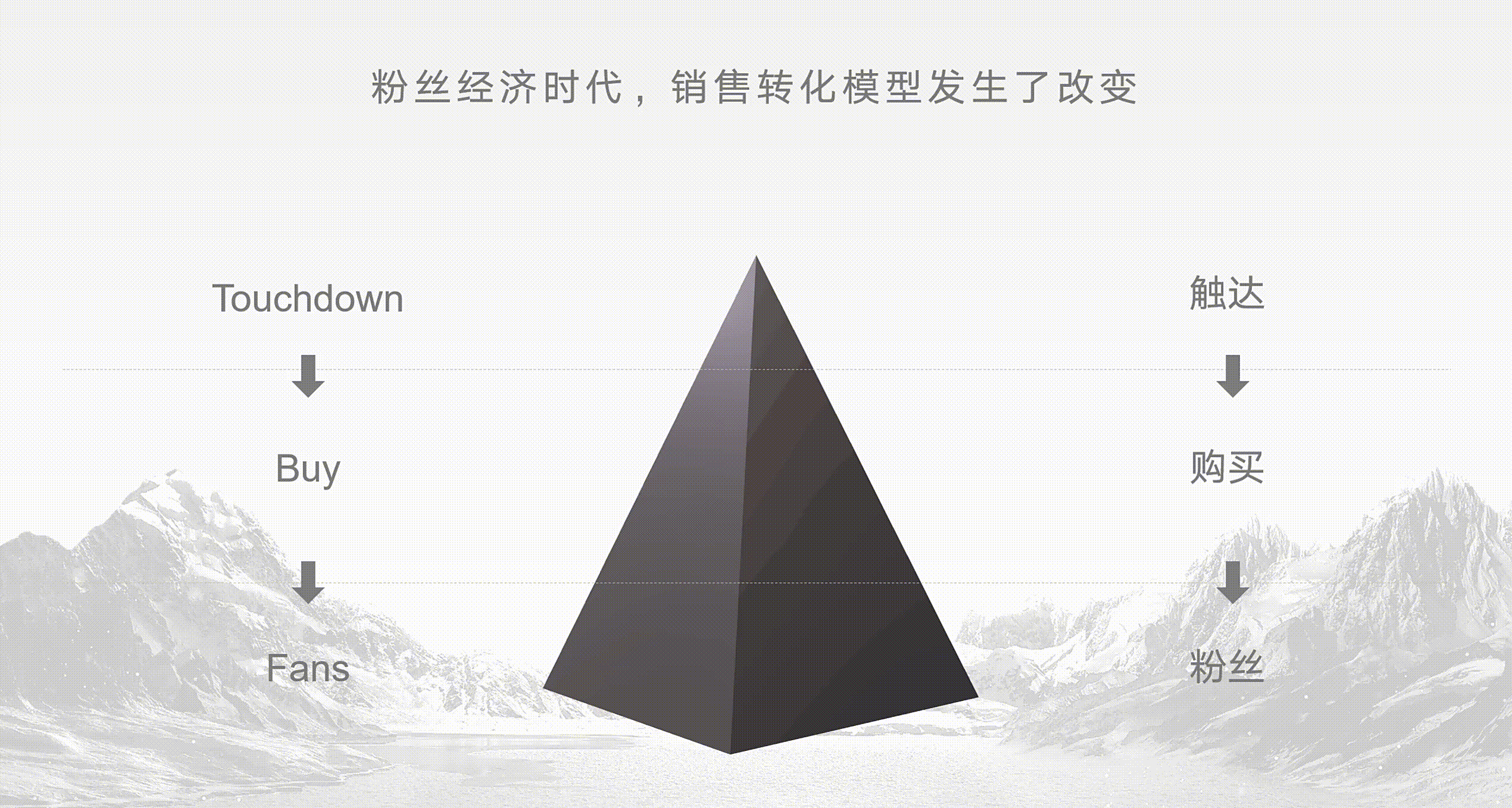 在PPTT具体页面的设计中,当我们想要展现一件事情发生了颠覆性的变化,比如销售转化模型发生了变化,用这个动画就会非常形象: