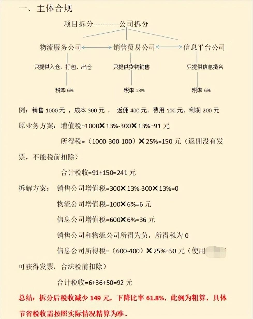把原先的一家贸易公司拆分为三家公司。在筹划方案中,当消费者购买产品后,平台会自动把收入拆分为三部分,分别是销售贸易公司销售产品收入,物流服务公司物流服务收入,以及信息平台公司的信息服务费收入,