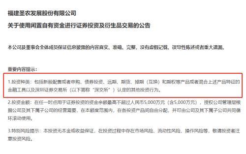 上周末,福建圣农发展股份有限公司(简称圣农发展)发布关于使用闲置自有资金进行证券投资及衍生品交易的公告。