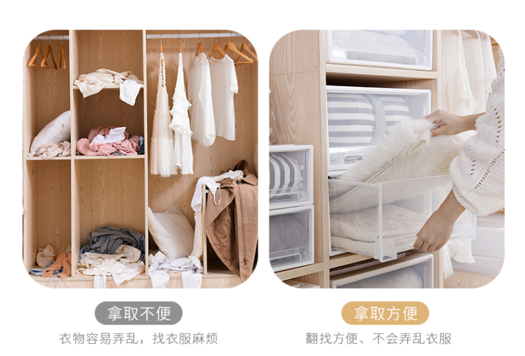 透明式的收纳盒设计,所有的衣服一目了然,采用结实的PP材质,承重能力非常强,除了可以帮助你收纳衣服之外,家中的小物件也可以摆放在里面。