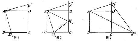 (3)如图3,将图1中的“直角”改为“∠EAF=45°”,当∠EAF的一边与BC的延长线相交于E点,另一边与CD的延长线相交于F点,连接EF。线段BE,DF和EF之间有怎样的数量关系?并加以证明。