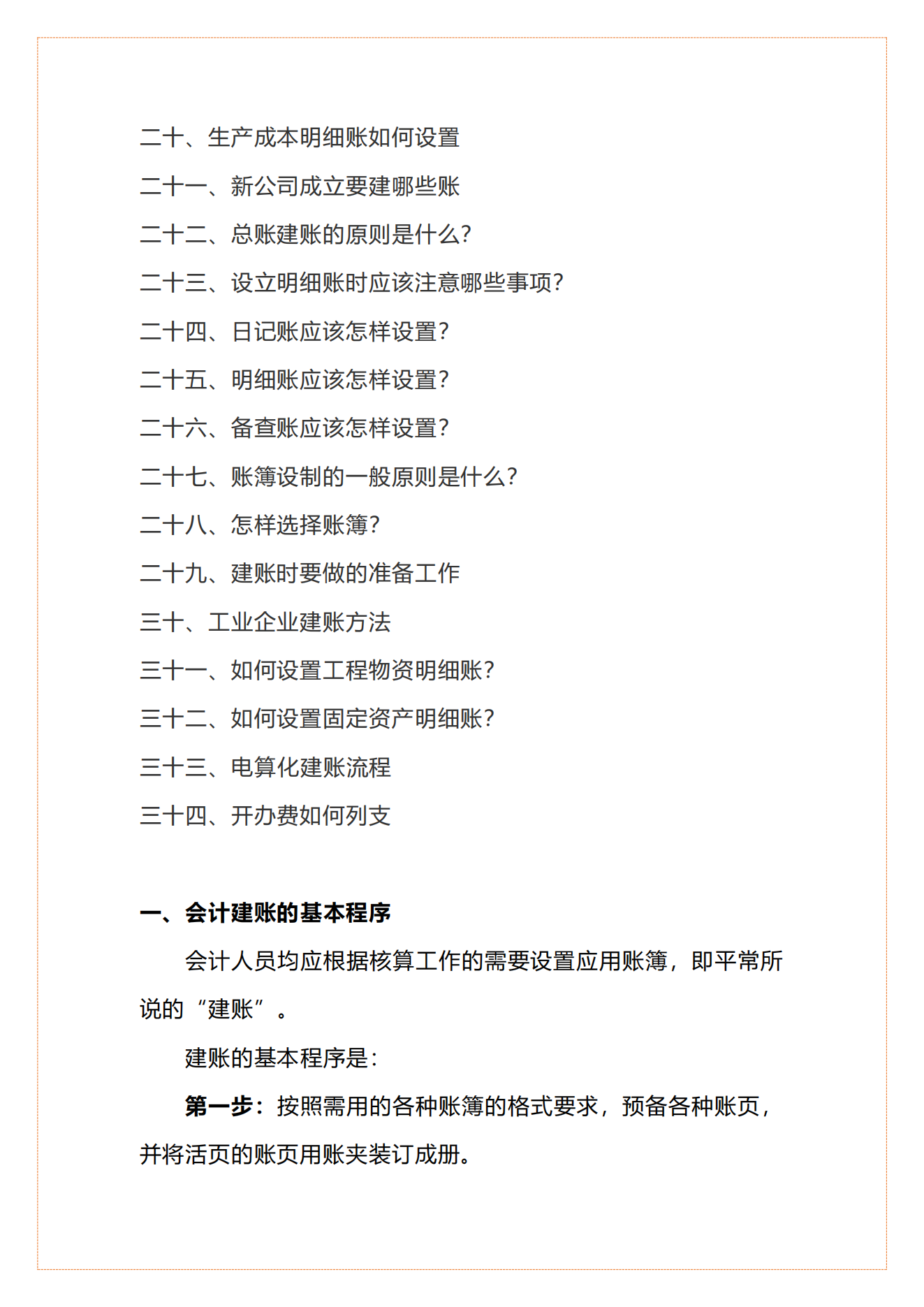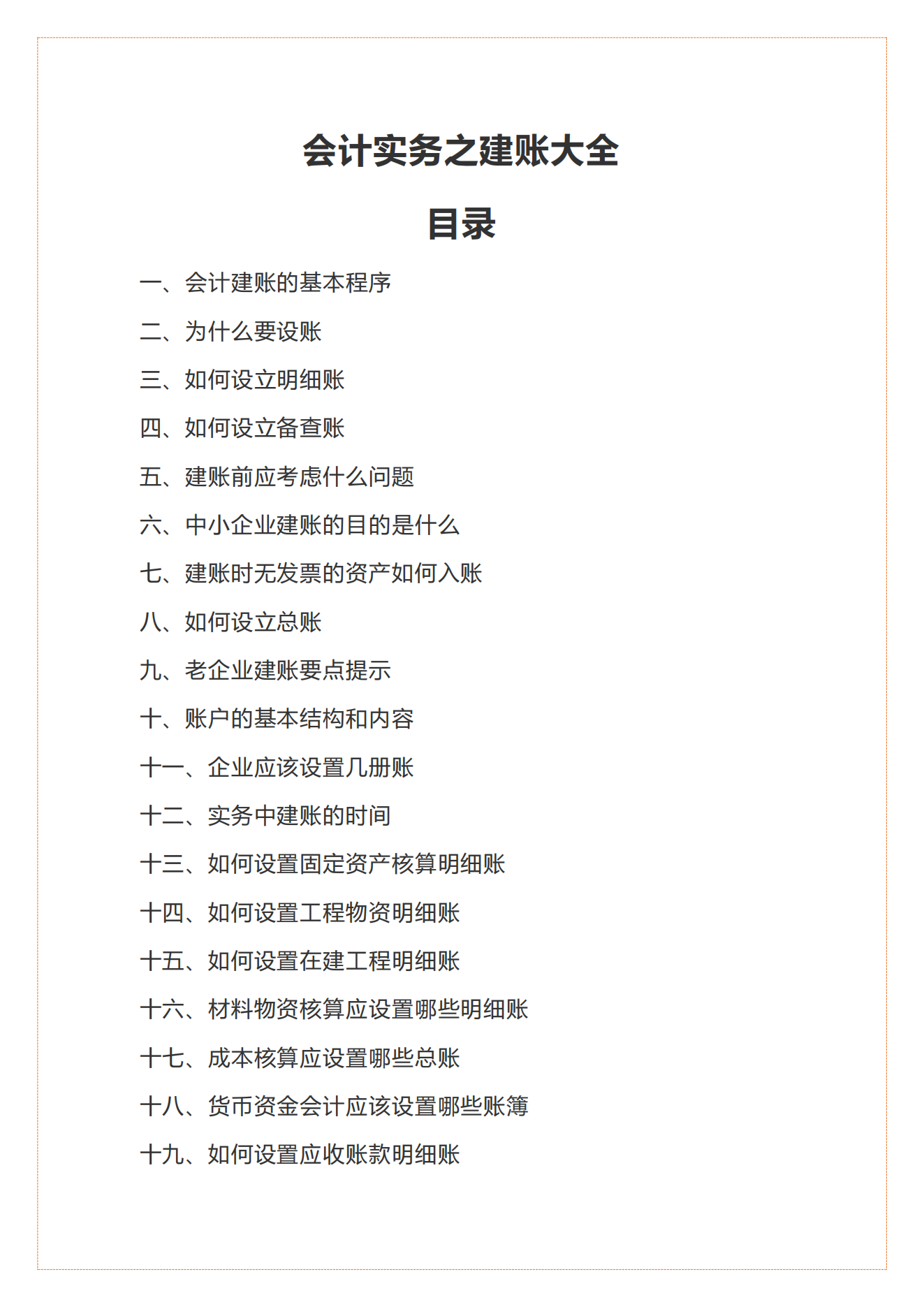 那么,建账作为咱们开展做账工作的第一环,我们到了实际工作中,到底应该如何根据公司的情况进行建账工作呢?最近我们财务室的“鬼才”老会计李姐闲来无事,就每天下班后加一会儿班,整理了一份会计实务建账教程大全,包含有整整52页,从建账入门到精通基本都包含!真是太实用了!建议咱们新手会计人手一份!