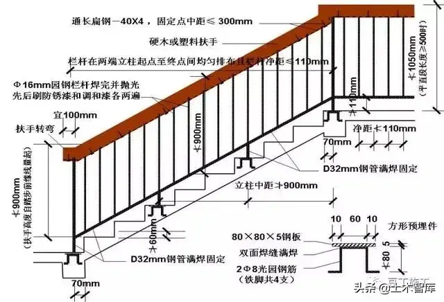 19、楼梯栏杆及扶手的安装必须符合设计要求。若设计无明确要求,楼梯井净宽大于0.20m的楼梯必须采取防止少年儿童攀滑的措施,楼梯栏杆应采取不易攀登的构造,当采用垂直杆件做栏杆时,其杆件净距不应大于0.11m。楼梯扶手高度自踏步前缘线量起不宜小于1.05m,水平扶手长度超过0.5m的,其高度不应小于1.1m。
