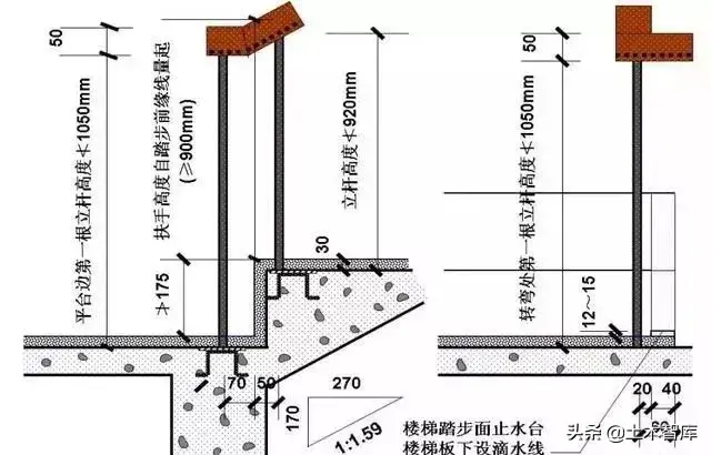 18、室内楼梯扶手高度自踏步前缘线量起不应小于0.90m。靠楼梯井一侧水平扶手长度超过0.50m时,其高度不应小于1.05m。而住宅、托儿所、幼儿园、中小学、少年儿童专用活动场所以及文化娱乐建筑、商业服务建筑、体育建筑、园林景观建筑等允许少年儿童进入活动的场所栏杆必须采取防止少年儿童攀登的构造,当采用垂直栏件做栏杆时,其杆件净距不应大于0.11m。