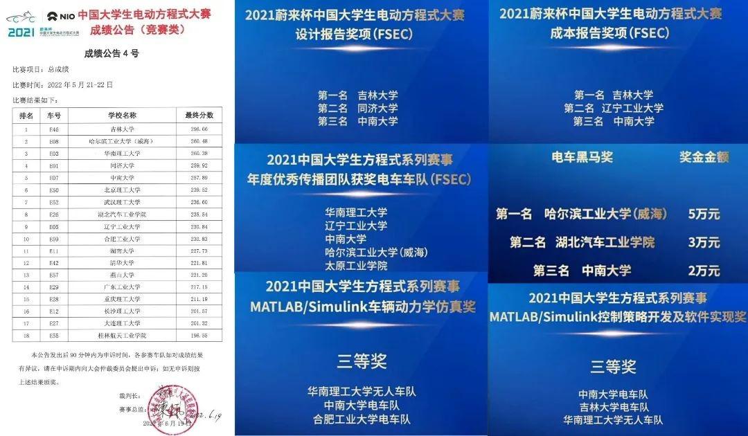 日前,由中国科学技术协会指导、中国汽车工程学会主办的2021中国大学生方程式系列赛事(FSC)于线上举行。在近日举办的颁奖典礼上,中南大学方程式赛车队在电车赛事(FSEC)中获得了总成绩全国第五名,全国一等奖,并突破性地夺得设计报告第三名、成本报告第三名、年度优秀传播团队、蔚来黑马奖第三名、MATLAB/Simulink车辆动力学仿真三等奖、MATLAB/Simulink控制策略开发及软件实现三等奖等单项奖项。