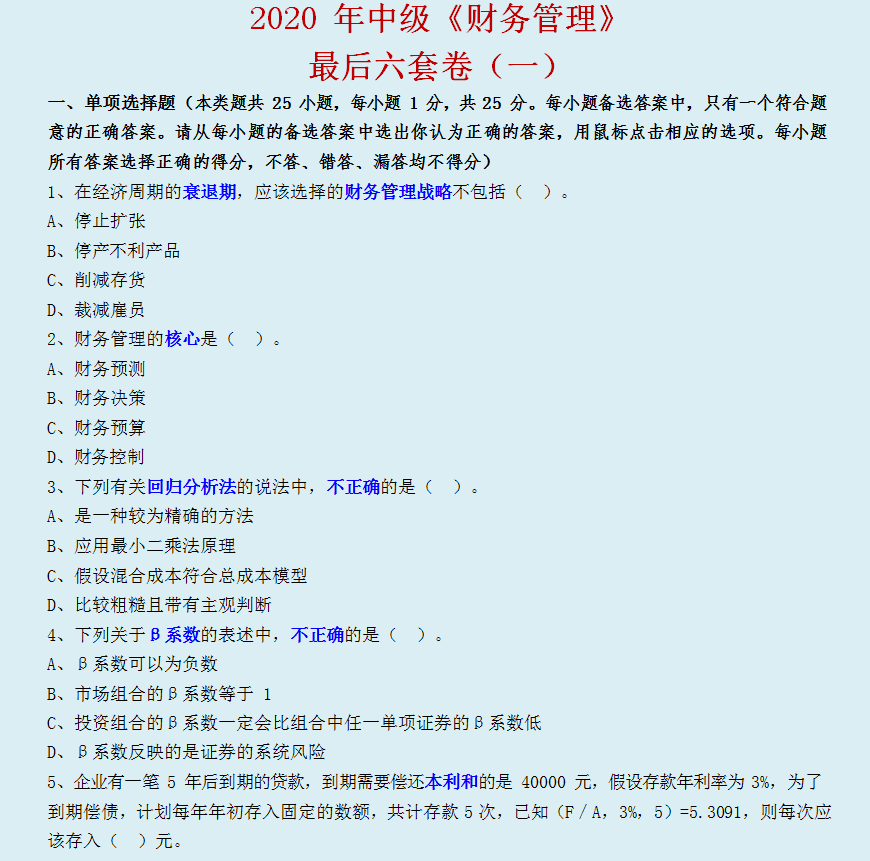 对于财务管理来说,理解它的原理、方法、和具体的计算公式很重要,而且一定要在理解的基础上来进行做题。还有就是不要对着答案做题,可以做完题对着答案理解完再自己做一遍。