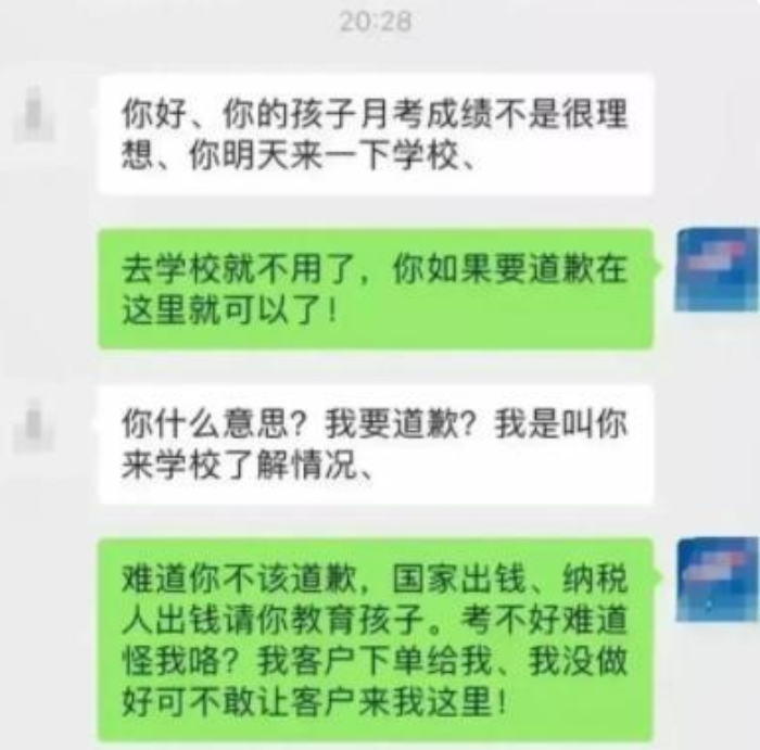 事情的起因源自一次月考,因为学生表现不佳,老师决定找家长谈话。可就在微信上通知家长的时候,对方一句话,却令老师感到无言以对。