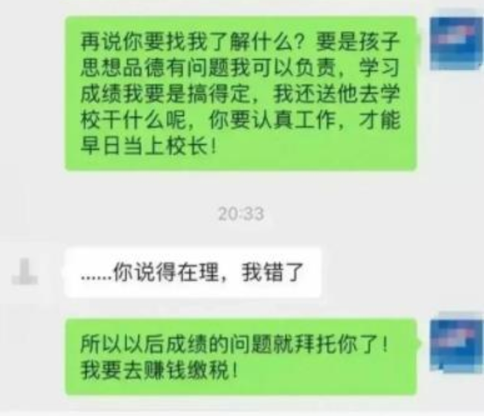 对方的回复真是很“大胆”:“你不用当面道歉”。原来他的意思是,学生成绩差,老师不应该找家长问责,反而应该对家长道歉。