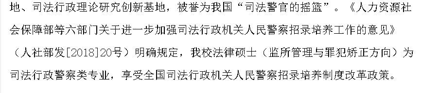 中央司法警官学院研究生只有监所管理与罪犯矫正这一个方向,并且,从2019年开始,法律硕士监所管理与罪犯矫正方向已经纳入司法行政人民警察招录便捷机制适用范围,学生毕业时可参加全国司法行政系统统一招警考试,研究生毕业入警率在90%以上,研究生毕业就业方面有官方相关文件可以参照,报考司法警校前大家可以去看看官方文件具体内容,下面是文件部分截图。