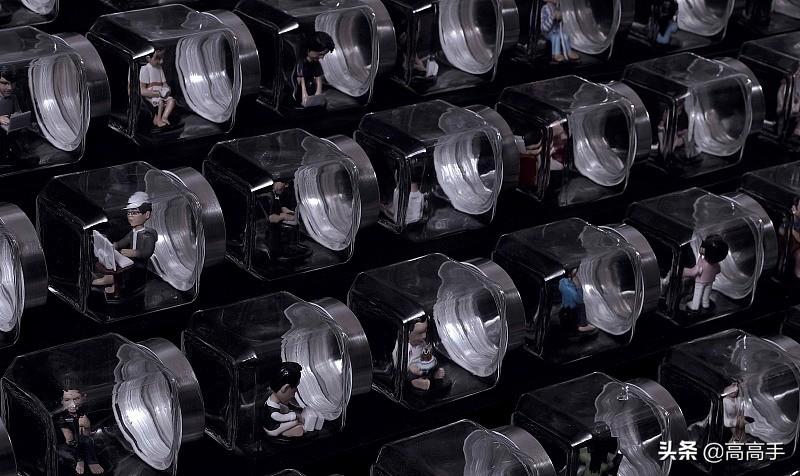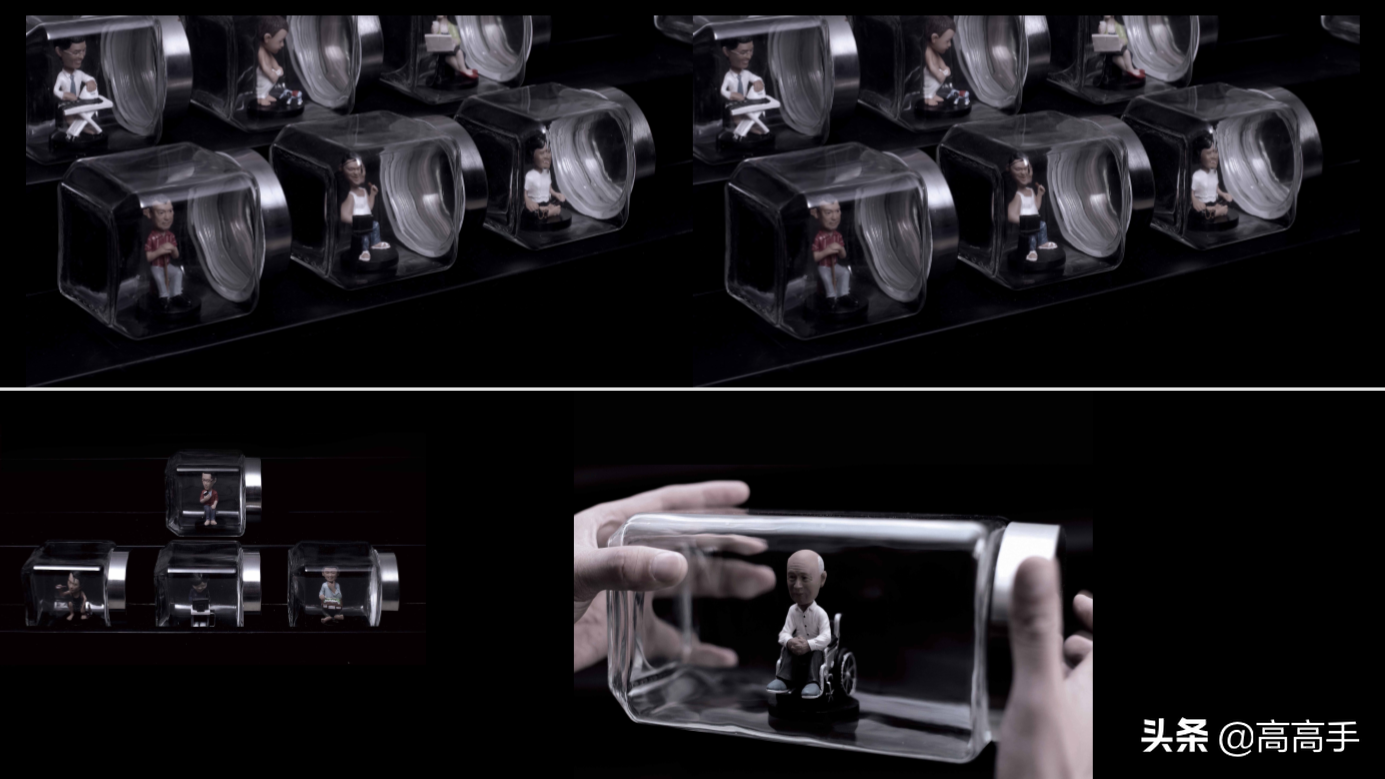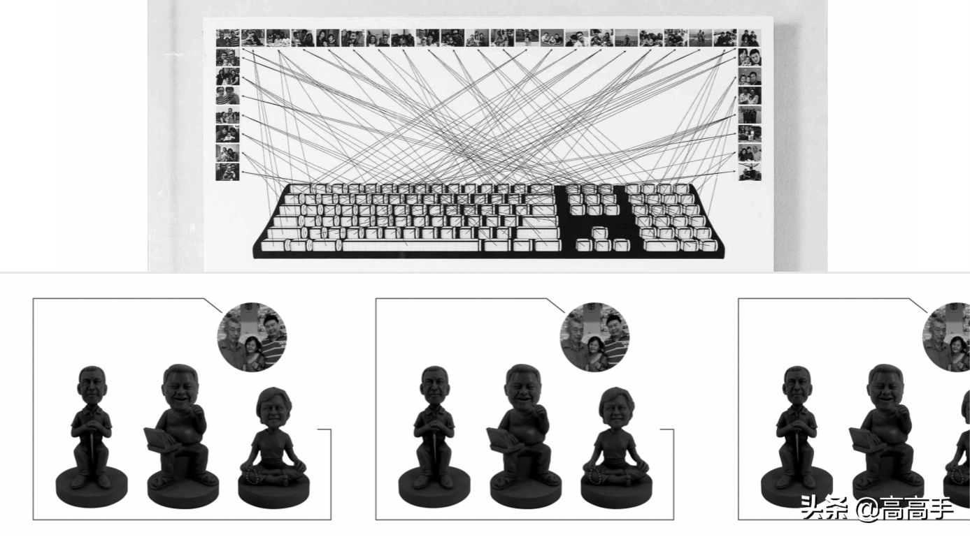 在这样的情况下创作,其实我采访了35个真实家庭,那个时候没有3D打印机,每一件作品每一件雕塑用手工雕塑出来的,重现电脑与手机隔离的情感。这是我公司的制片和他的父母,他们被不同的玻璃体隔着放在不同的按键里。