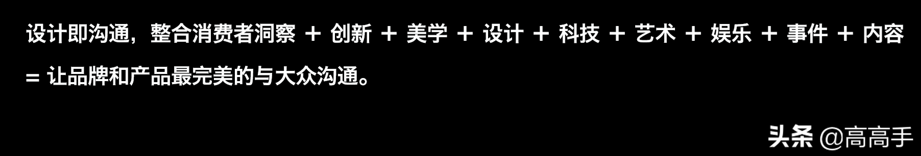 人类其实不变的,在任何时代不管过去、将来,消费者洞察+创新+美学+设计+科技+艺术+娱乐+事件+内容,才是品牌和产品最完美的结合。
