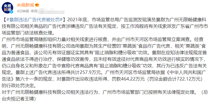2021年底,市监局广告监测发现景甜为广州无限畅健康科技有限公司相关产品代言涉嫌违法,之后按照正规流程进行依法核查处理。