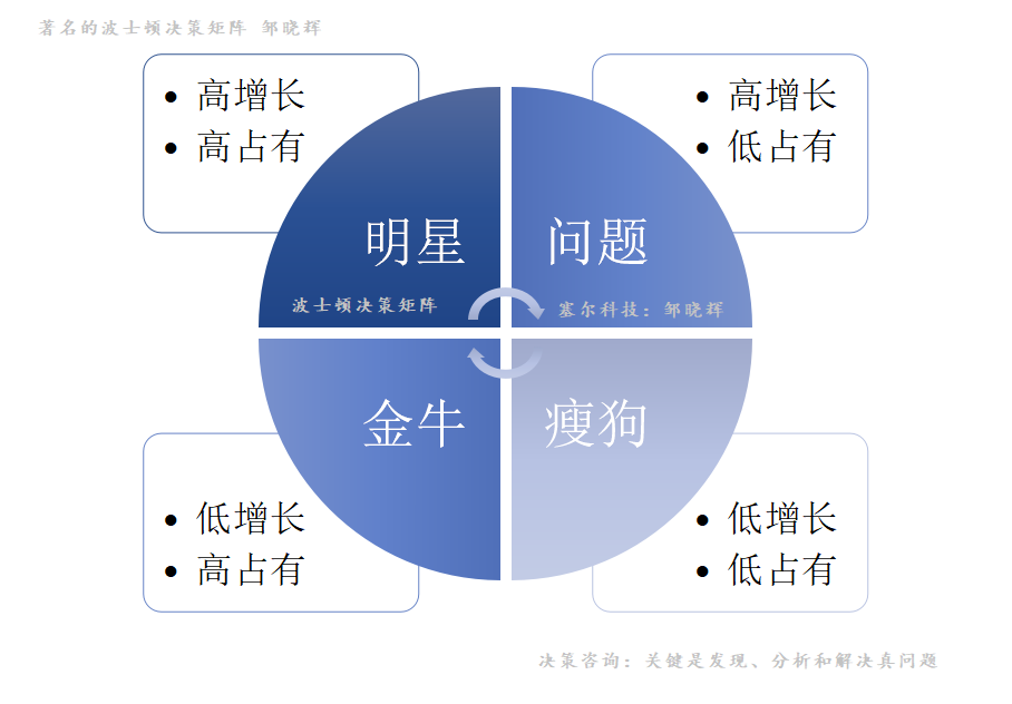 成败得失和利他利己的关系中蕴含着一系列耐人寻味的问题。借助波士顿矩阵再次重温其中奥妙。感慨之余不觉得了一首顺口溜:小小矩阵藏玄机,善于应用启灵机,成败得失转眼间,辅助决策得先机。