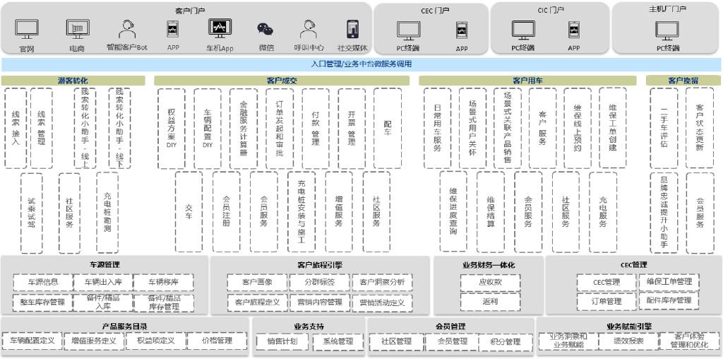 一个完整的整车销售的客户旅程可通过图1来描述,分为潜客转化、客户成交、客户用车、客户挽留几个阶段。每个阶段会根据不同的客户触点和业务场景衍生出许多子客户旅程定义。客户体验管理部门很重要的职责之一,是识别能够提升客户体验的客户旅程,然后定义在CIC+CEC数字化平台上。