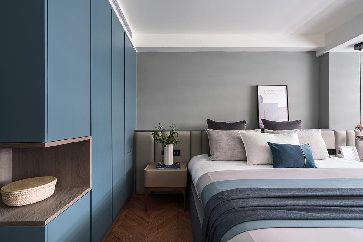 美式风格的卧室,不管是床头的软包设计还是蓝灰色的柜体都透露着美式的气息,首先是人字拼的木地板将卧房的温润感传递,灰色的墙面沉稳低调,给睡眠营造出了一个最佳的环境。
