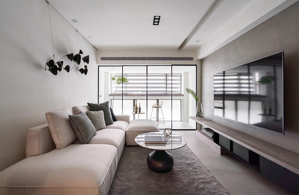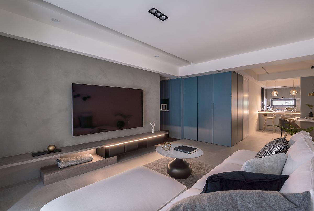 客厅上沙发墙上的大面积留白对应的是,质地温润的灰质纹理电视墙设计,同时与仿清水模的地砖相衬,光线相映于灰凝与白色之间,营造出美式的大气。