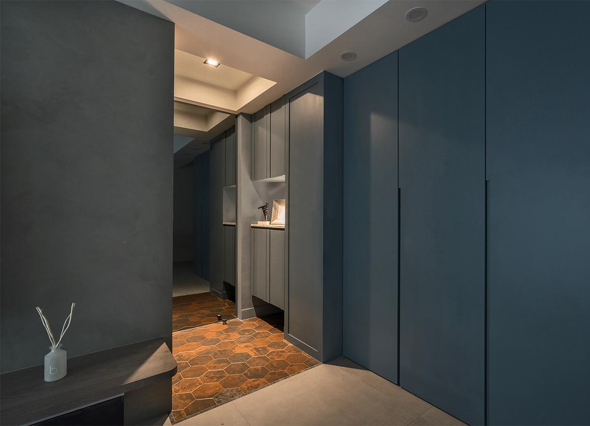 玄关上使用了一面灰镜来制造视觉上的宽阔感,并透过夺目的古铜金六角砖,划分出了落尘区和入户区域,同时玄关上专门定制了美式风情十足的威灵顿蓝的收纳柜,奠定了美式风格的基调。