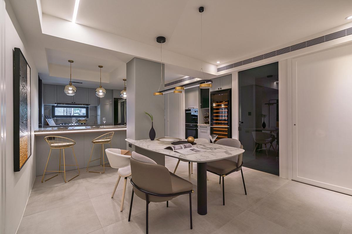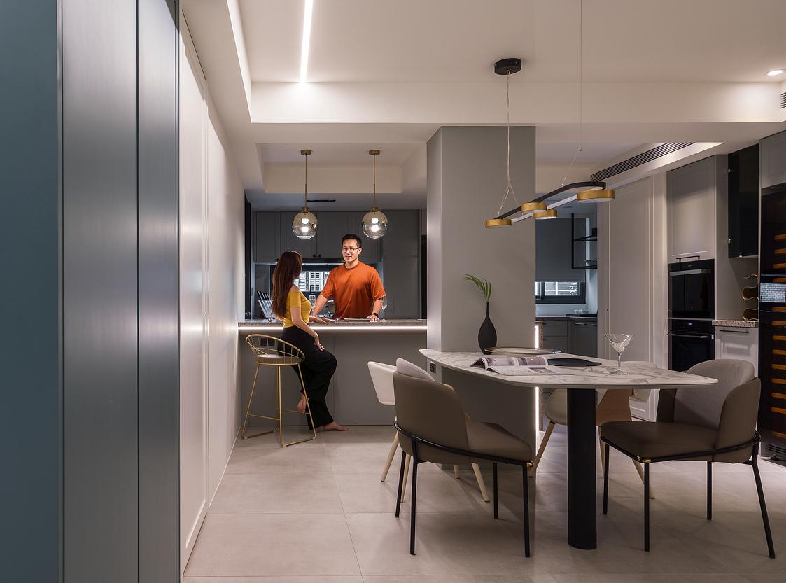 原本被视为障碍物的梁体,改以灰蓝色的来弱化视觉冲击,并巧妙地承接出了一个料理小吧台和餐厅桌。