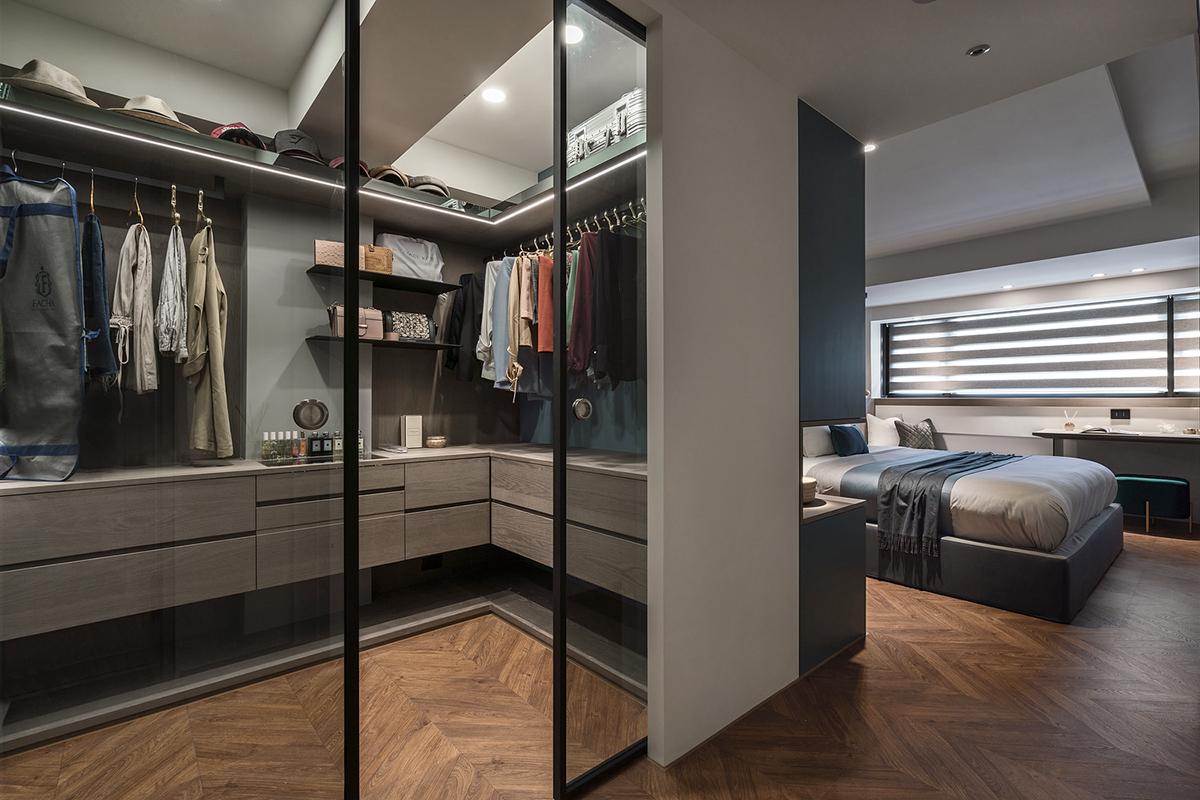 顺势错开樑下的位置,一道灰色玻璃划分出一个衣帽间。
