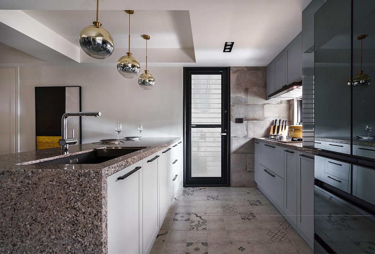 看到改造后从户型图可知厨房格局做了大变动,因为夫妻俩喜欢做各地的小吃,用美食来治愈每天的好心情,因此,开放式的美式中岛厨房成设计重点,为了完美置入内嵌式、玻璃面的家电,透过大理石材质筑起一式中岛台面,厨房上下收纳柜以美式线板收边,地面上则以花砖铺设,打造出一个美式风格的大气厨房。那么一起来看看那装修设计效果吧!