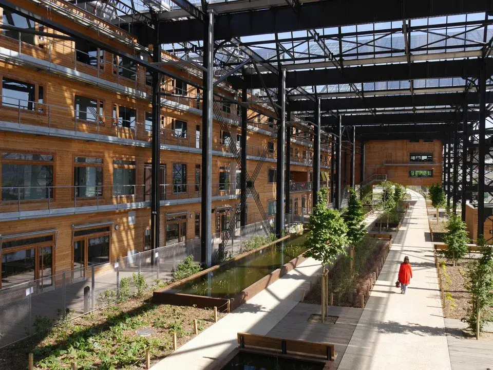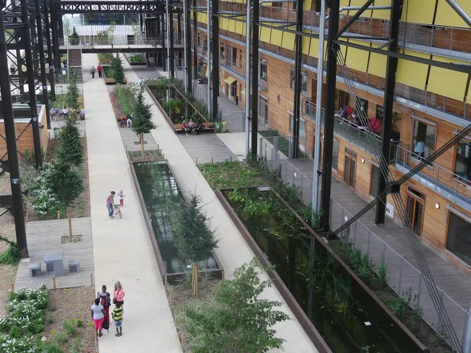 项目利用原有纺织厂旧址,旨在为工人住宅和复合中心枢纽创造新的公共空间。原丝织厂的标志性元素水塔、工厂外墙和部分车间,在改造中被保留并突出强调;通过种满植物的步道,强调工业历史;成为休闲和游乐的公共空间。为了减少资源消耗,设计团队最大限度地重新利用了建筑现存部分和地面,前厂房的混凝土板被用作停车场的基础,将混凝土板切割后又形成了停车场中的种植区。设计团队在人口稠密的新开发区中创造了一处绿洲,传承了该城市的工业遗产。
