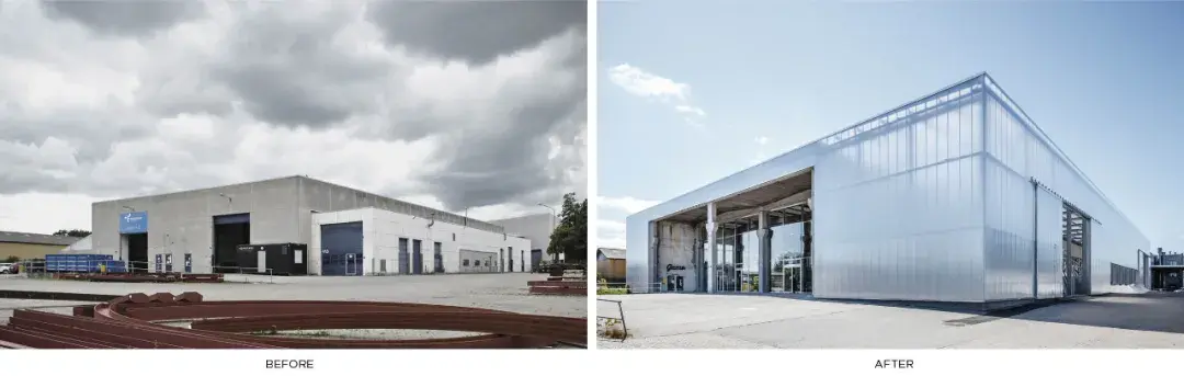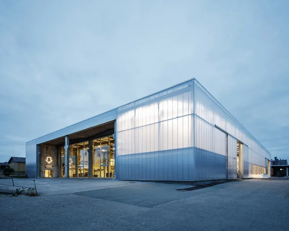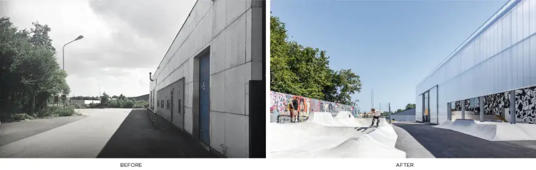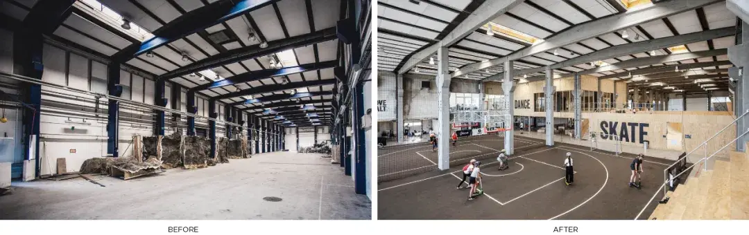 项目前身是20世纪60、70年代的风车工厂,这种仓库或工厂通常由预制混凝土板或波纹钢制成,是西方国家最常见的工业遗存,一般被认为没有历史、文化和建筑价值。设计团队打开原有不透明、空旷的工业建筑,将其中心部分转变为新的室内空间。用新的表面半透明材料覆盖原有建筑破旧预制混凝土面板外立面,营造出轻盈温馨的建筑外观。改造赋予建筑跑酷、篮球、滑冰、攀岩、舞蹈空间以及定制工作室等新功能。